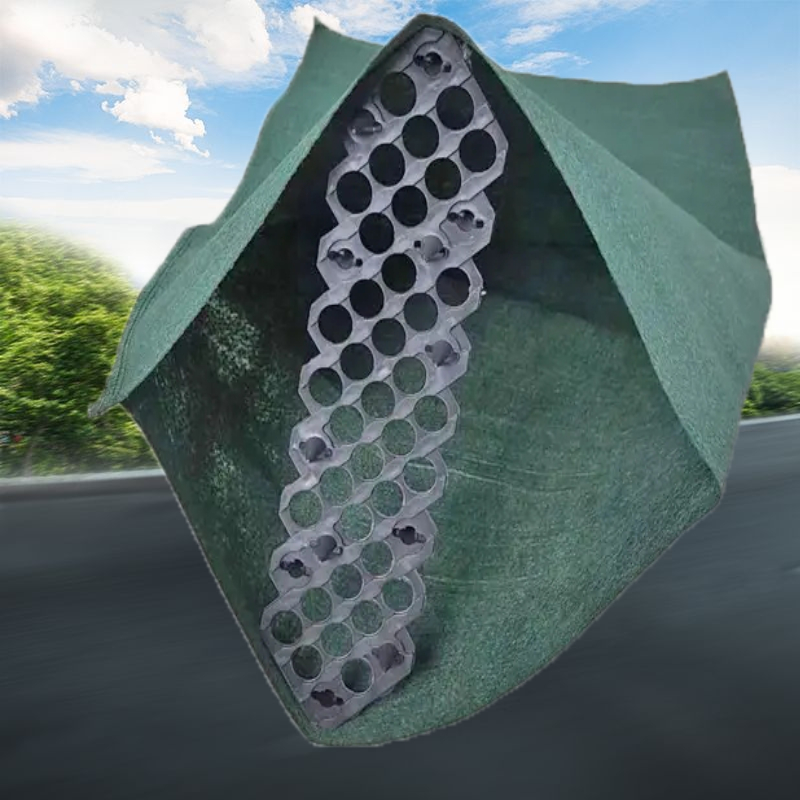 生態袋防護結構是由生態袋、聯接扣和封口線組成的生態環保係統。其中,生態袋是由以聚丙烯為原材料製成的雙麵熨燙針刺無紡布加工而成,袋內充填混有植被種子的土壤,其強度高、抗老化,對植物友善,具有透水不透土的過濾功能。生態袋防護結構能就地取土裝袋施工,施工速度快,無需養護,能夠快速實現管溝回填和地貌恢複,可減少因砌石結構施工不及時而造成的水土流失問題。同時生態袋具有較高的繞曲性,有利於局部沉降而與環境融合,更好地與原土嵌合。